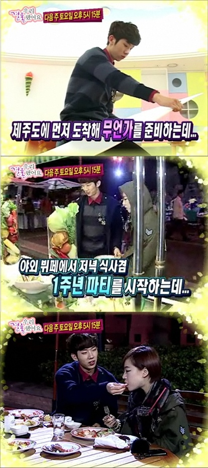 이렇게 고민하는 조권에게 '사랑의 징검다리'로서 함께 여행을 떠나게 된 제아 처형이 이벤트를 도와주겠다며 팔을 걷어붙이고 나섰고, '1주년 이벤트 합동작전'으로 의기투합한 조서방-제아 처형 콤비는 가인-슬옹 팀이 제주도에 도착하기 전까지 약 2시간 이라는 짧은 시간 동안 첫 만남 때보다 업그레이드 된 '초대형'선물, 과자집을 선물했다.