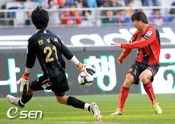 후반 서울 정조국이 문전에서 슛을 시도했으나 부산 전상욱 골키퍼의 선방에 막혀 추가골에 실패하고 있다./soul1014@osen.co.kr