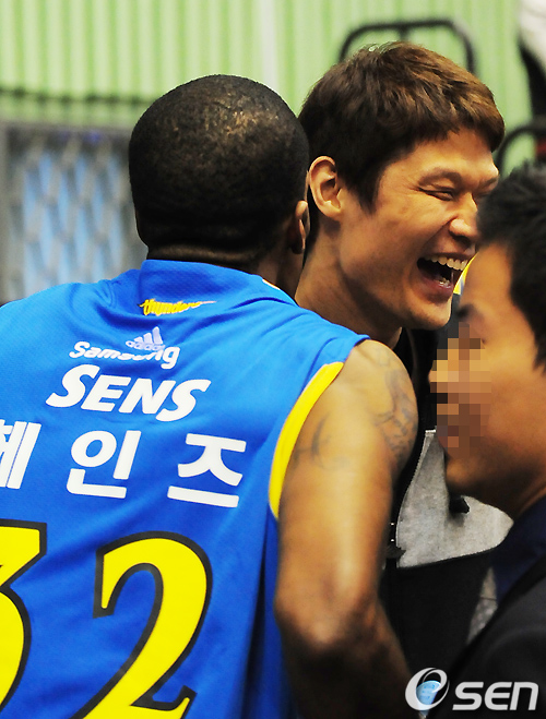 경기를 마치고 헤인즈가 경기를 관람하던 같은 삼성 소속의 국가대표 이규섭과 포옹을 하고 있다./rumi@osen.co.kr