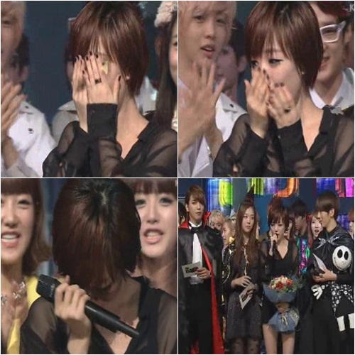 성공적인 솔로 활동을 펼친 그룹 브라운아이드걸스의 가인이 가요프로그램 첫 1위를 달성하며 눈물을 보였다.