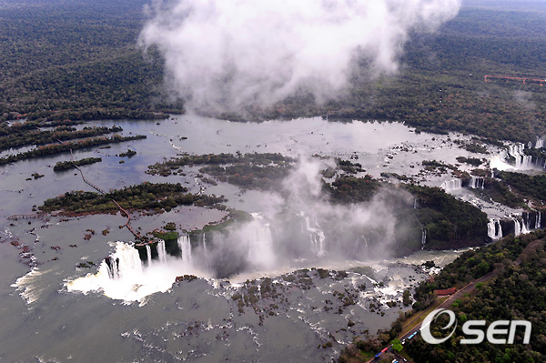 하늘에서 내려다 본 이구아수 폭포의 전경.