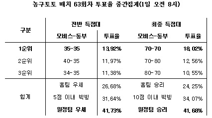 전반전 역시 41.73%를 획득한 동부가 26.68%에 그친 모비스에 리드할 것으로 나타났다.