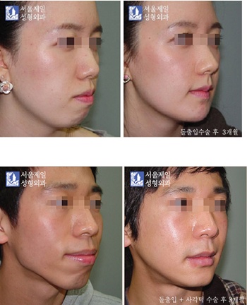 돌출입수술은 다른 외과수술과 마찬가지로 혈종이나 감염의 위험이 있고, 감각신경 손상이나 치근손상의 우려가 있으며, 무엇보다도 만족스럽지 못한 모양이나 합죽이가 될 가능성이 있으므로 숙련된 성형외과 전문의에게 수술받는 것이 매우 중요하다. /생활경제팀 osenlife@osen.co.kr <사진>돌출입 여성 수술의 증례(아래 사진 위)와 돌출입수술+사각턱수술 남성의 증례.