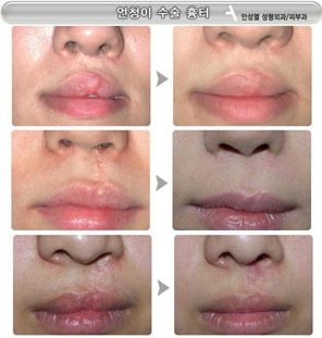 입술라인은 인중라인과 연결되는 선 교정을 Z-성형술로 수술하여 깨어진(함몰된) 백선의 연결선을 교정한다. 이러한 것은 인중 옆에서 콧구멍으로 진행되는 흉터 선을 교정 하면 좋아질 수 있다.
