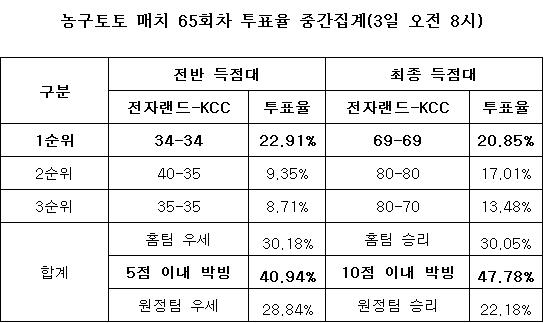 홈팀 전자랜드의 승리에 투표한 참가자는 30.05%고, 나머지 22.18%는 원정팀 KCC의 승리를 내다봤다. 전반전 역시 5점차 이내 박빙승부를 예상한 참가자들이 40.94%에 달했다. 전반 득점대의 경우 34-34점대 5점차 이내 접전이 22.91%로 1순위를 차지했고, 최종 득점대에서도 역시 낮은 점수대인 69-69점대가 20.85%로 최다를 기록했다.
