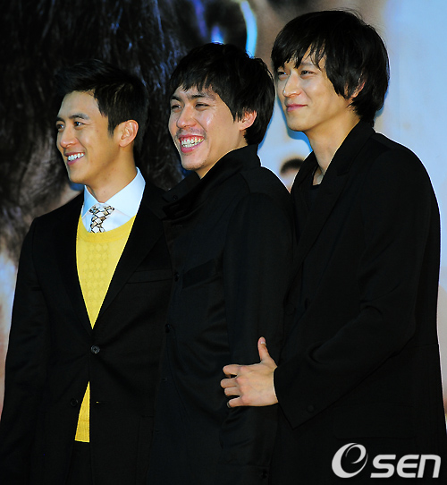 무대 위에서 고수와 김민석 감독, 강동원이 포토타임을 갖고 있다. /rumi@osen.co.kr