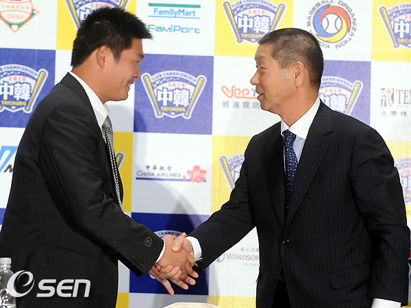 SK 김성근 감독이 슝디 천루이전 감독과 인사를 나누고 있다 /soul1014@osen.co.kr