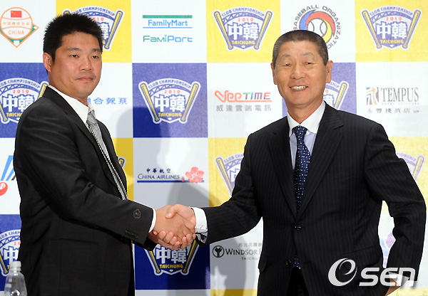 SK 김성근 감독이 슝디 천루이전 감독과 인사를 하고 있다. /soul1014@osen.co.kr