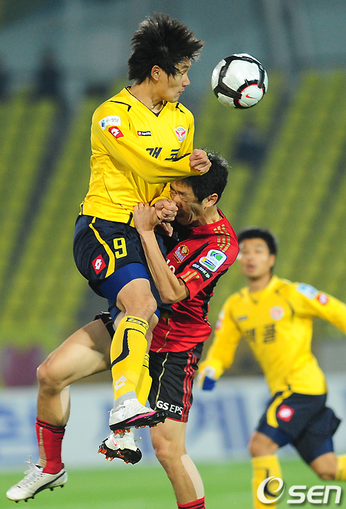 전반 성남 조동건과 서울 현영민이 공중볼을 다투며 충돌하고 있다. /jpnews@osen.co.kr