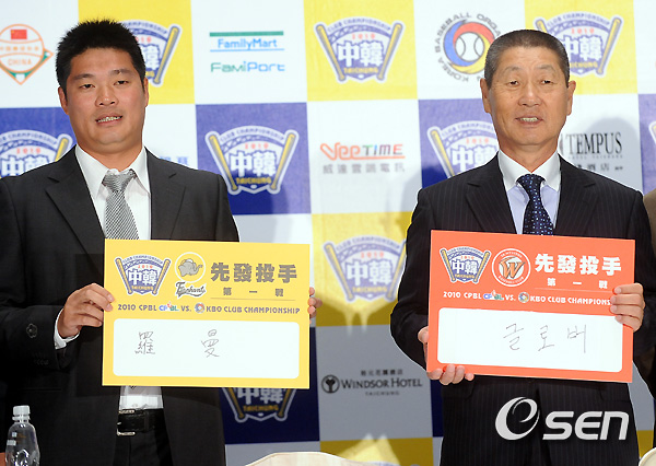 SK 김성근 감독과 슝디 천루이전 감독이 1차전 선발투수를 발표하고 있다. SK는 글로버 슝디는 로만. /soul1014@osen.co.kr