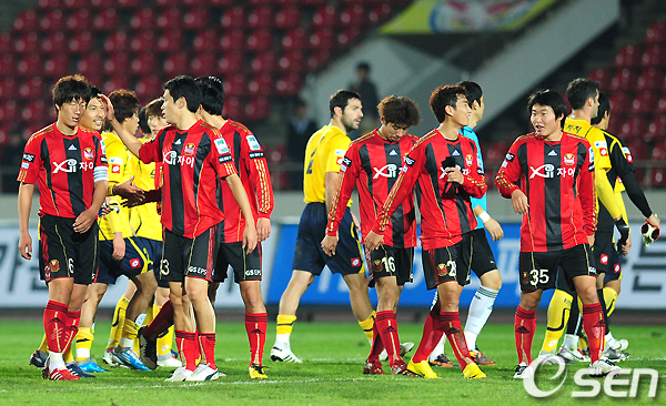 경기후 승리한 서울 선수들이 기뻐하는 반면 성남 선수들이 고개를 숙인채 그라운드를 나서고 있다. /jpnews@osen.co.kr