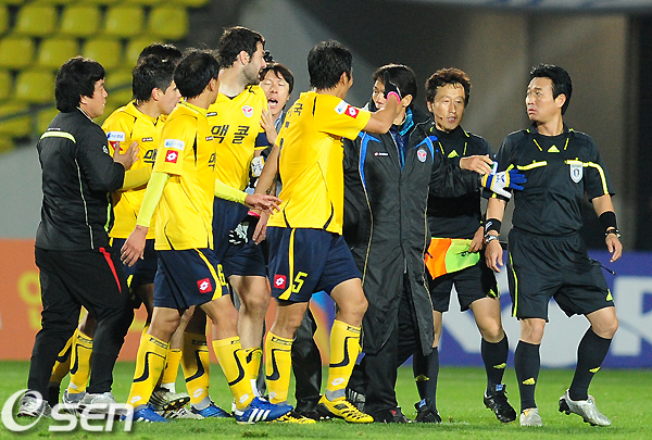 경기후 신태용 성남 감독이 고금복 주심에게 항의하는 선수들을 진정시키고 있다. /jpnews@osen.co.kr