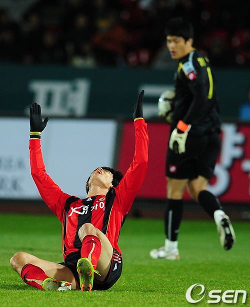 후반 서울 정조국이 문전에서 성남 김태윤에 밀려 넘어지며 주심 판정에 아쉬워하고 있다. /jpnews@osen.co.kr