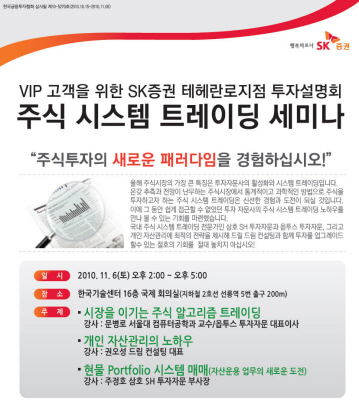 SK증권 테헤란로 지점(지점장 김성중)은 11월 6일(토) 오후 2시부터 5시까지 한국기술센터 16층 국제회의실(지하철 2호선 선릉역 5번 출구)에서 주식 시스템 트레이딩 세미나를 개최한다고 밝혔다.