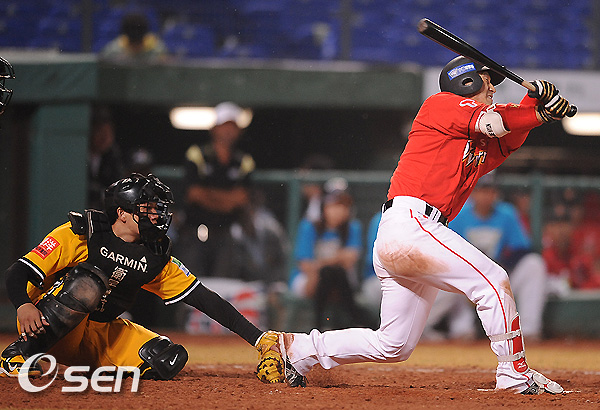 SK 5회초 2사 만루 김재현의 타구가 원바운드로 포수 글러브에 들어갔지만 주심은 파울팁으로 인정 아웃이 됐다./soul1014@osen.co.kr