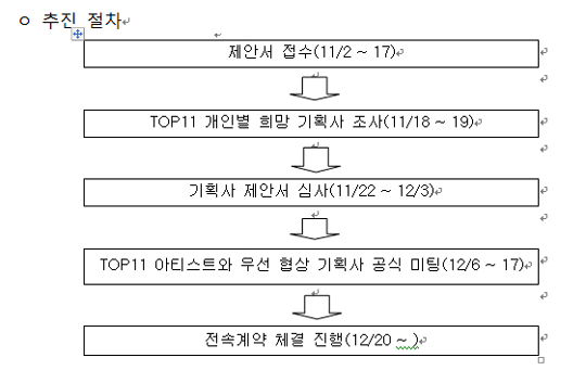 엠넷은 1차 서류를 통해 “영입 희망 아티스트명 및 영입 희망 사유, 계약 조건 및 계약 내용(구체적으로), 아티스트 경력개발 계획(음반/음원 기획·제작, 공연, 방송 등 분야별로 가능한 자세한 계획을 명기, 아티스트 육성·지원 계획 등)”을 써내라고 지시한 상태. 또 회사 조직도 및 회사 소개, 과거 및 현재 전속 보유 아티스트 현황, 최근 3년간 주요 활동 연혁 등도 요청했다.