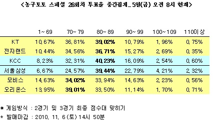 [농구토토] 스포츠토토 공식 온라인 발매 사이트인 베트맨(www.betman.co.kr)은 오는 6일(토) 오후 3시부터 펼쳐지는 KT-전자랜드(1경기), KCC-삼성(2경기), 모비스-오리온스(3경기)전 국내 프로농구 3경기를 대상으로 한 농구토토 스페셜 26회차 투표율을 중간집계한 결과, 3경기 모두 10점차 이내 박빙승부가 펼쳐질 것으로 예상됐다.