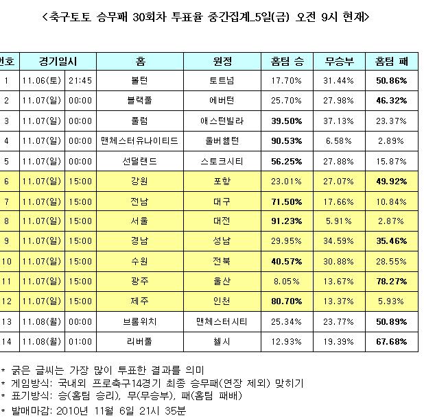 오리온 그룹계열의 스포츠토토 온라인 공식 발매사이트인 베트맨(www.betman.co.kr)은 오는 6일부터 8일 새벽(한국시간)까지 벌어지는 국내 K-리그 7경기와 프리미어리그 7경기 등 총 14경기를 대상으로 하는 축구토토 승무패 30회차 투표율 중간집계 결과 맨유-울버햄턴전에서 축구팬 90.53%가 홈팀 맨유의 승리를 예상했다고 밝혔다.