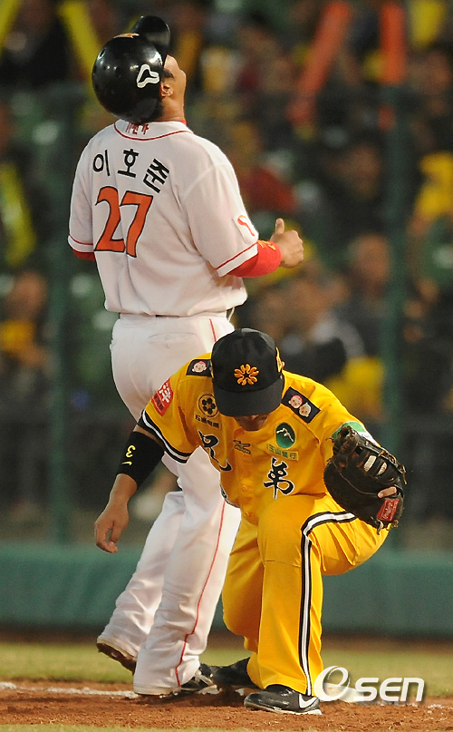 SK 2회말 안타로 진루한 이호준이 최정의 3루수 직선타구때 귀루가 늦어 아웃되고 있다. /soul1014@osen.co.kr