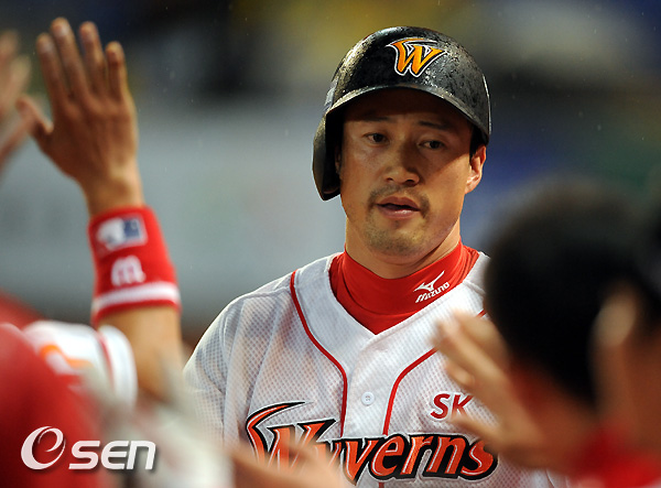 SK 6회말 적시타를 친 김재현이 계속되는 찬스서 이호준의 내야땅볼때 홈을 밟고 동료들의 환영을 받고 있다. /soul1014@osen.co.kr