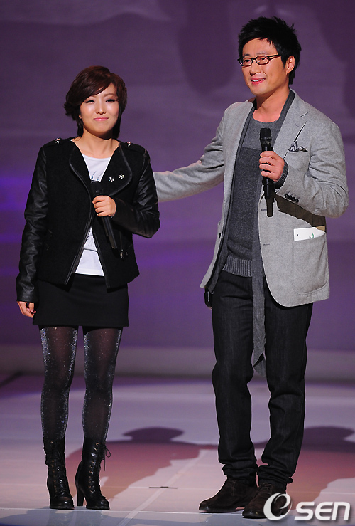 무대 위에서 박신양과 정인이 노래를 부른 후 인사를 하고 있다./rumi@osen.co.kr