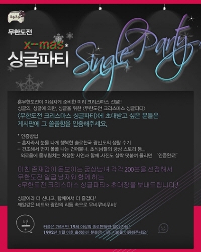 '무한도전'은 5일 방송 막바지에 싱글 파티 개최 소식을 알렸다. 공식 홈페이지에는 "'무한도전'이 야심차게 준비한 크리스마스 선물!"이라며 싱글파티 응모조건이 제시돼 있다.