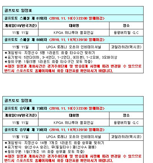 한편, 골프토토 스페셜 87회차와 승무패 73회차는 10일 오후 10시까지, 골프토토스페셜 88회차와 승무패 74회차는 11일 오후 8시 50분까지 각각 게임에 참여할 수 있다