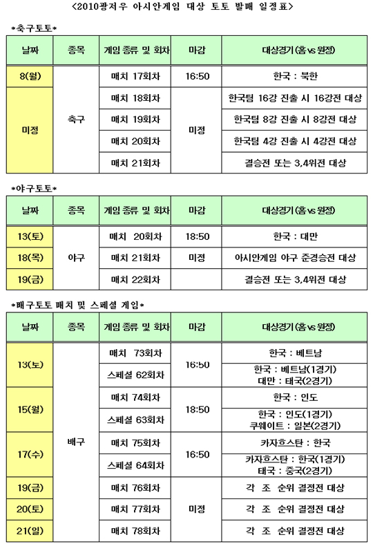 2010 아시안게임 대상 토토 게임 발매…축구, 농구, 야구, 배구 등 대상