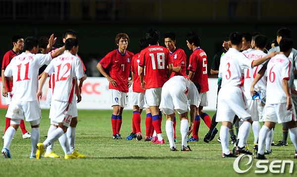 경기후 패배한 한국 선수들이 아쉬운 표정을 짓는 반면 북한 선수들이 승리를 기뻐하고 있다. /jpnews@osen.co.kr