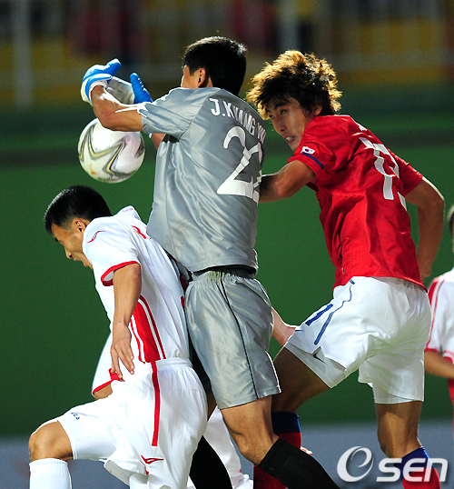후반 한국 장석원에 앞서 북한 주광민 골키퍼가 공중볼을 따내고 있다. /jpnews@osen.co.kr