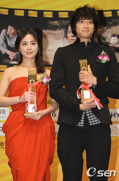 서영희-강동원,'남-여우 연기상 트로피 들며'