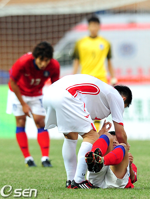 후반 북한 안철혁이 한국 서정진에 반칙을 범하고 일으켜 세워주고 있다. /jpnews@osen.co.kr