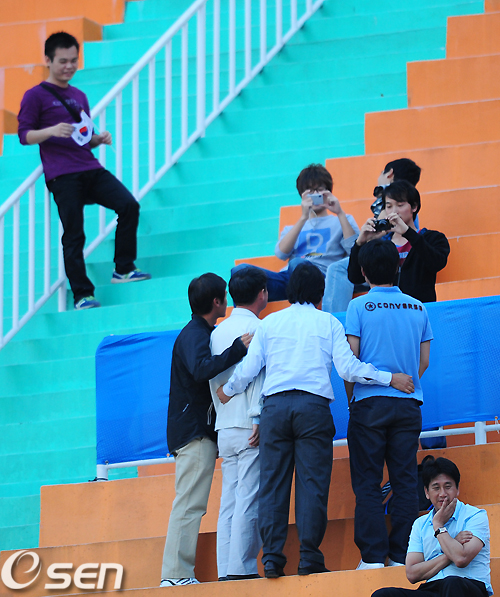 하프타임에 조광래 한국 대표팀 감독이 팬들과 사진을 촬영하고 있다. /jpnews@osen.co.kr