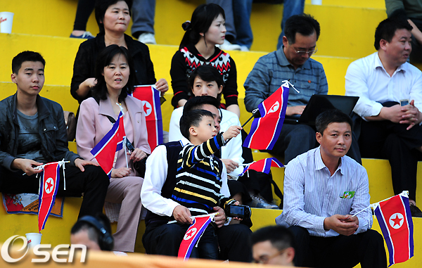 후반 북한 응원단이 인공기를 흔들며 응원하고 있다. /jpnews@osen.co.kr