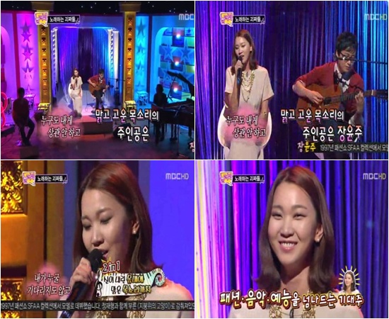 8일 방송된 MBC 예능 프로그램 '놀러와-노래하는 괴짜들' 편에 출연한 장윤주는 오프닝에서 감미로운 목소리로 노래를 불러 눈길을 사로잡았다. 예상외의(?) 아름답고도 감미로운 장윤주의 목소리에 취한 객석과 MC들은 놀라는 표정이었다.