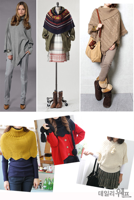 한편, 짧은 길이의 판쵸는 걸리시한 분위기를 더해주는데, 터틀넥 위에 걸쳐 재킷 대용으로 포인트를 줄 수있다. 쌀쌀한 날씨에는 야상점퍼나 코트 같은 아우터 위에 덧입으면 색다른 룩을 연출할 수 있어 유용한 아이템이다.