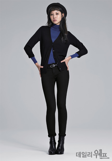 추워진 11월, 코트 속이나 패딩 점퍼 속에 카디건을 입어주면 따뜻한 보온성까지 갖추고 있어, 활용하기 좋은 머스트해브 아이템이 될 것이다. 룩 전체에 멋쟁이 컬러 블랙을 반영해, 스키니 팬츠와 워커를 함께 매치하고, 페도라를 살짝 써주어 그녀만의 카디건 룩을 완성했다.