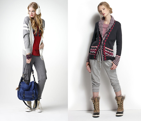쥬시꾸띄르는 니트스웨터와 스트라이프 패턴의 루즈한 카디건을 편안한 저지 소재 트레이닝복과 매치해, 프레피 룩을 연출했다. 스쿨 걸을 연상케 하는 체크 메신저백, 하이 탑 스니커즈 등 10대부터 20대 초반이 좋아할 만한 요소들로 카디건 코디에 포인트를 주었다.