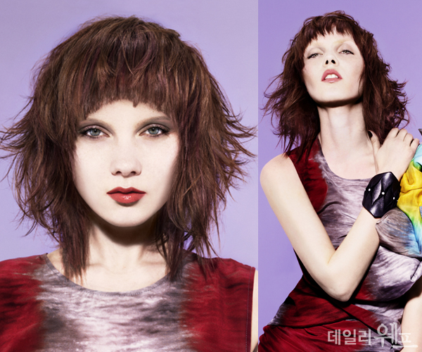 THE CUT : 대중적인 긴머리에 재미를 주어 발랄한 느낌. 우아함을 탈피, 정돈되지 않은 느낌과 헝클어진 듯한 마무리로 심플하면서도 독특한 느낌을 연출. 젊은 느낌의 스타일로 많은 질감과 앞머리는 ‘M’ 자 모양의 패턴을 이용해 레이어로 연출. 두상 형태에 따라 지그재그 패턴을 이용한 커트.