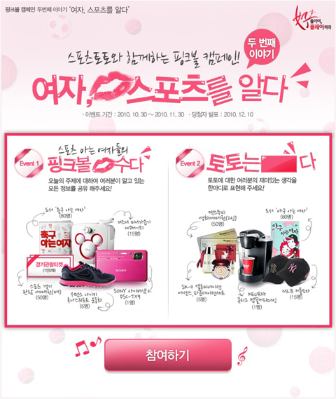 ‘스포츠 아는 여자들의 핑크볼 수다’ 이벤트는 아시안게임, 축구, 농구, 배구와 관련된 주제에 자신이 알고 있는 정보를 25자 이내로 적어 공유하는 이벤트이다. ‘축구계를 뒤흔들 기대되는 유망주는?’, ‘아시안게임에 이런 종목이 있는 줄 몰랐어요’ 등과 같은 주제로 진행된다. 이벤트 참가자 중 추첨을 통해 디지털카메라(1명), 스포츠 운동화(5명), 미니가습기(15명), 스포츠경기 관람 예매권(50명), 도서 ‘축구 아는 여자’(80명)를 경품으로 지급한다.