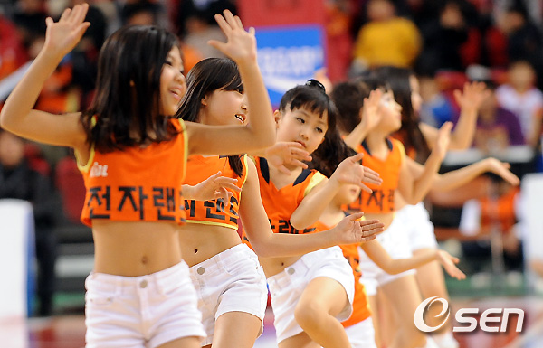 작전타임 때 전자랜드 꼬마 치어리더들이 귀여운 안무를 보이고 있다./soul1014@osen.co.kr
