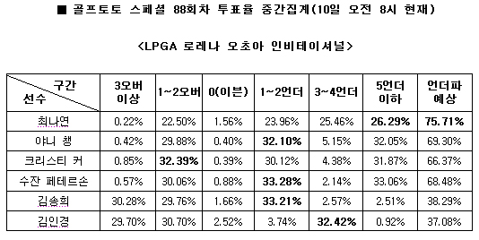 최나연의 뒤를 이어 야니 챙(69.30%), 수잔 페테르손(68.48%), 크리스티 커(66.37%)도 비교적 높은 언더파 가능성이 점쳐졌다. 반면 김송희(38.29%), 김인경(37.08%)은 언더파 가능성이 비교적 낮을 것으로 전망됐다.