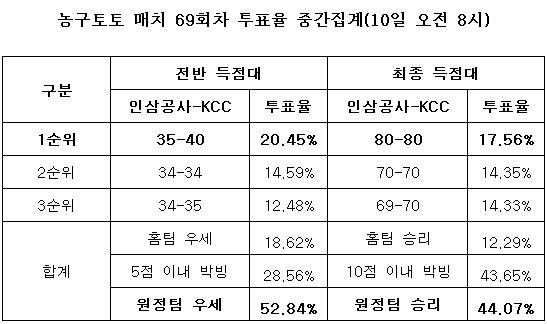체육진흥투표권 수탁사업자인 오리온그룹 계열의 스포츠토토 공식 온라인 발매사이트인 베트맨(www.betman.co.kr)은 오는 11일(목) 오후 7시에 안양 실내체육관에서 벌어지는 2010-2011시즌 프로농구 인삼공사-KCC전을 대상으로 한 농구토토 매치 69회차 투표율을 중간집계한 결과, 전체 참가자의 44.07%가 KCC가 인삼공사를 상대로 우세한 경기를 펼칠 것으로 내다봤다.