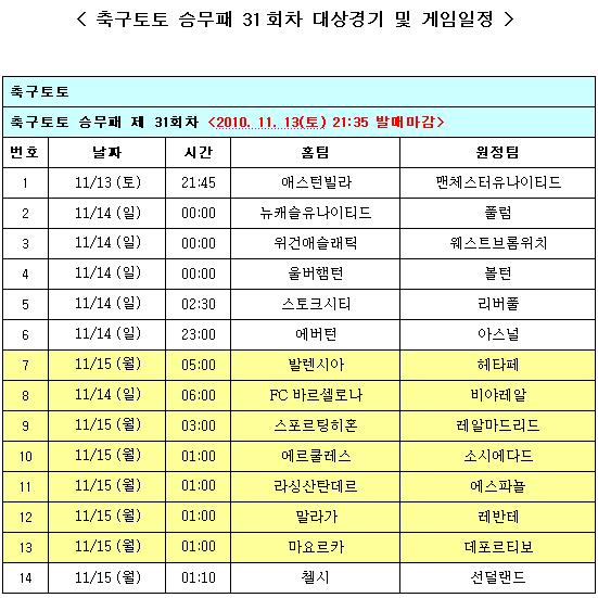 축구토토 승무패 31회차 게임은 1경기 애스턴빌라-맨유전 시작 10분전인 13일 오후 9시 35분에 발매가 마감된다.