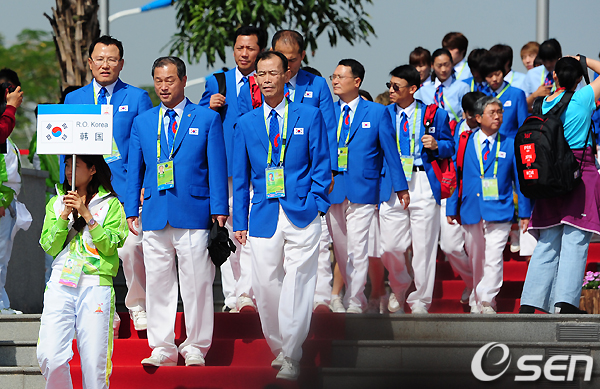 <사진> 입촌식 때 기수 바로 뒤 오른쪽으로 노민상 감독이 이동하고 있다. / 광저우=지형준 기자 jpnews@osen.co.kr