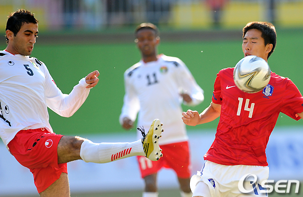 전반 요르단 알리 모하메드가 김정우에 앞서 공을 걷어내고 있다. /jpnews@osen.co.kr