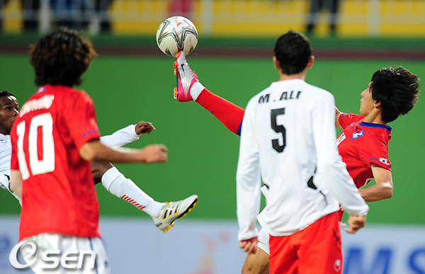 후반 한국 지동원이 볼을 따내고 있다. /jpnews@osen.co.kr