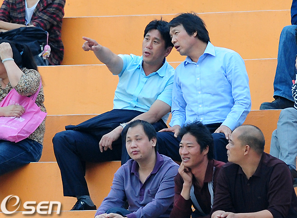 후반 한국대표팀 조광래 감독이 박태하 코치와 경기를 관전하며 이야기를 나누고 있다. /jpnews@osen.co.kr