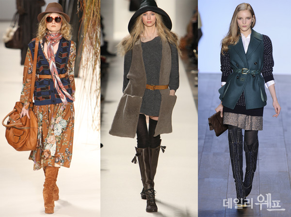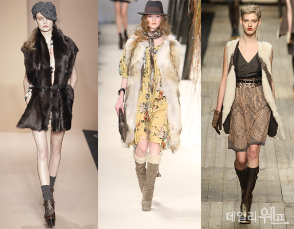 겨울이지만 날씬한 각선미가 드러나는 미니원피스와 함께 퍼 베스트를 입거나 겐조처럼 보헤미안 플라워 원피스 위에 화이트 퍼 베스트와 퍼 트리밍 롱부츠까지 맞춰 입으면, 청담동 며느리 못지않은 고급스러움을 자아낼 수 있다.
