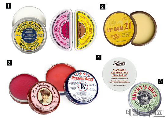 버츠비의 '미라클 셀브'(사진5)는 풍부한 지방산을 함유한 호박씨 오일과 올리브 오일 등이 피부와 머리카락에 영양을 공급해 주고 보호해준다.